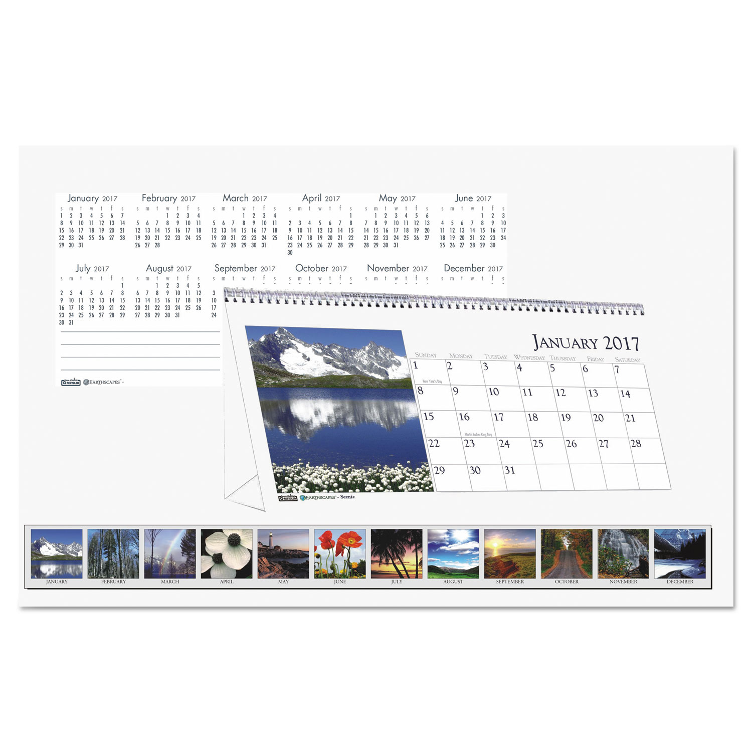 Dated January through December desktop tent calendar is printed on recycled paper made from 100 percent post-consumer material